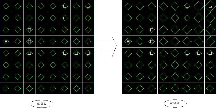 ちなみに、「学習後」って書いてあるやつは十分学習させたもので、「移動→学習」という動作を一億回やらせたものです。